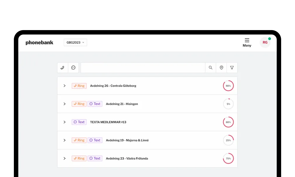 Phonebank är framtaget särskilt för valrörelser och andra typer av mobiliseringskampanjer. Höga volymer kontakter i kombination med komplexa organisationsträd – och nya europeiska standarder för hantering av personuppgifter och säkerhet – är anledningen till att vi utvecklade Phonebank.