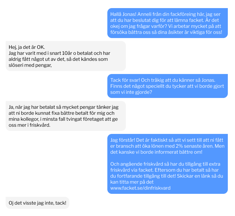 De flesta som slutar betala medlemsavgiften gör det på grund av att det saknas en personlig relation. Att ta personlig kontakt med medlemmar ökar därför alltid viljan att vara kvar som betalande medlem.