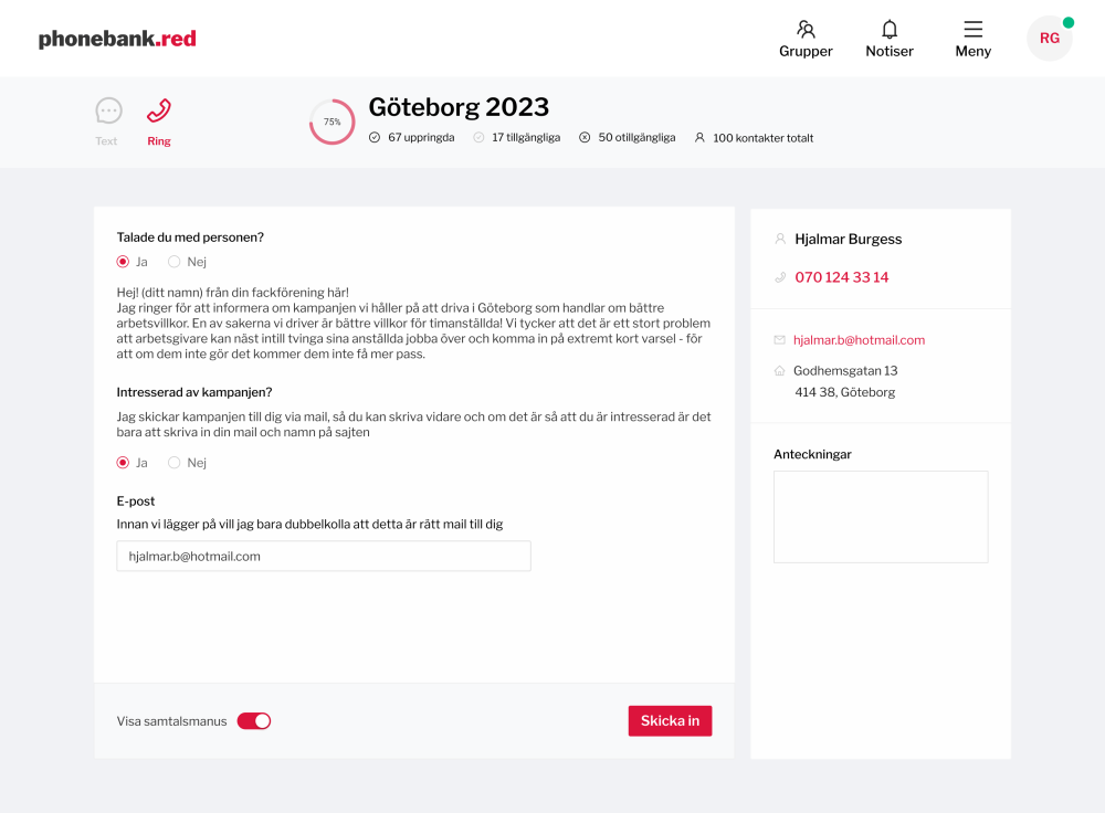 Phonebank är särskilt designad för valrörelser och andra typer av kampanjer som bygger på mobilisering. Höga volymer kontakter i kombination med komplexa organisationsträd – och nya europeiska standarder för hantering av personuppgifter och säkerhet – är anledningen till att vi utvecklade Phonebank.