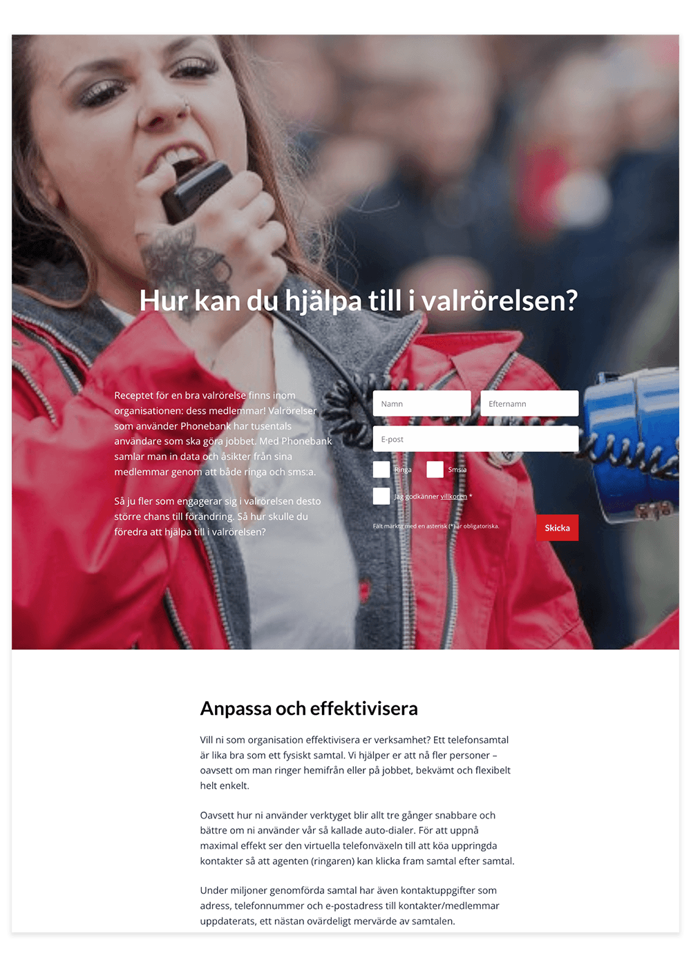 Dessutom ska kampanjledare lika snabbt och enkelt kunna arbeta i verktyget. Allt detta – "behörighetsmanagement" som vi kallar det – klarar Phonebank galant. Gärna i kombination med en insamlingssida, där ni kan låta alla valarbetare signa upp sig.