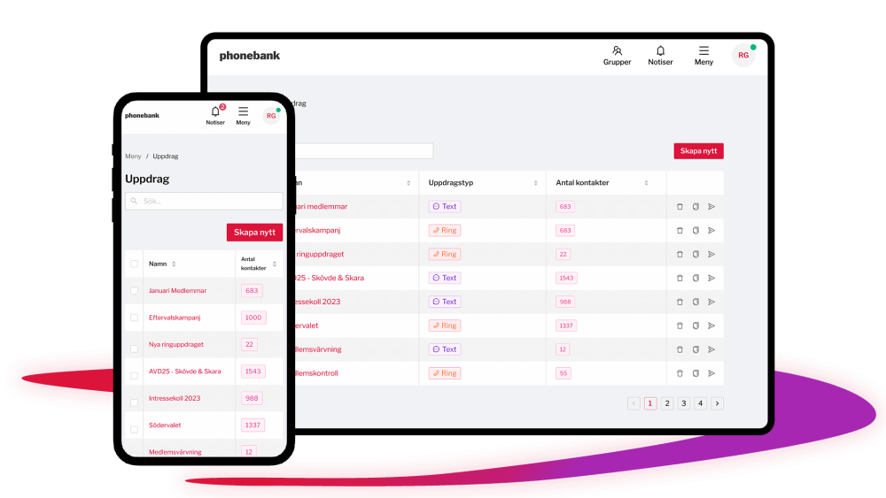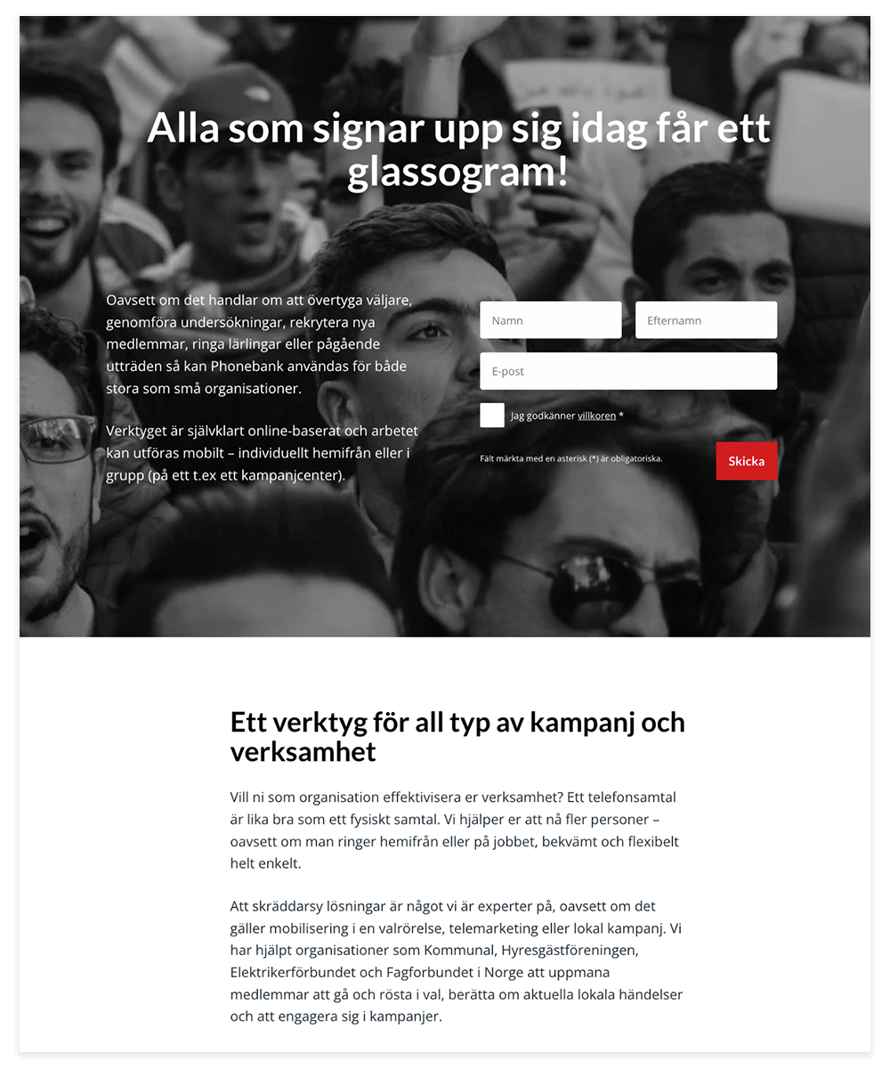 Phonebank ingår i ett kraftfullt system som har stöd för insamling och organisering av kontakter. Som administratör kan du enkelt skapa en insamlingssida med er logotyp, typsnitt och färger, som ni skickar ut till medlemmar som ni exempelvis vill ska bli förtroendevalda. Formuläret är integrerat med Phonebank och därför kan ni löpande kontakta alla ni samlar in via SMS och telefonsamtal (och e-post såklart).
